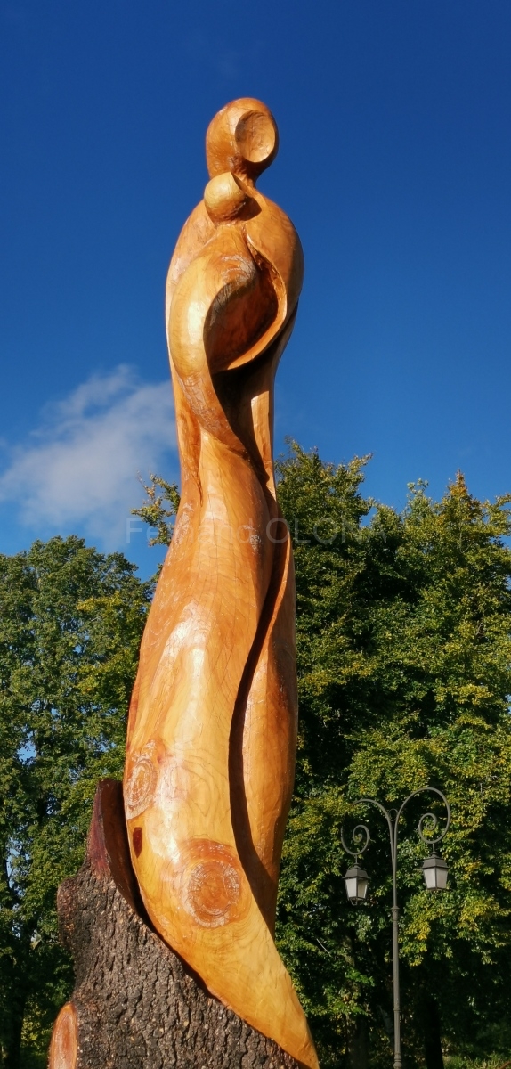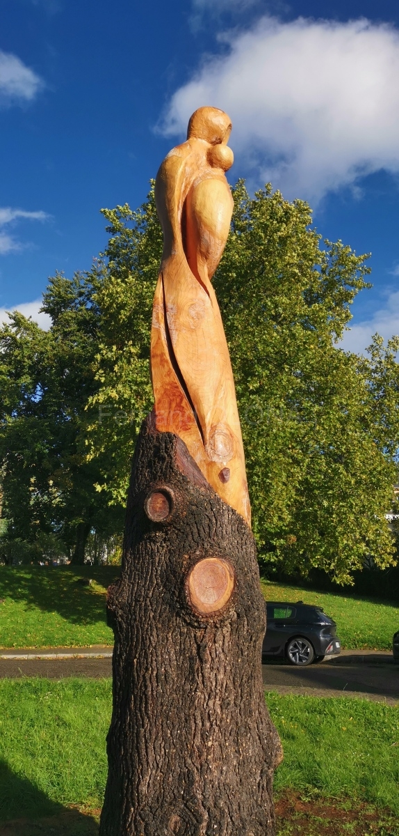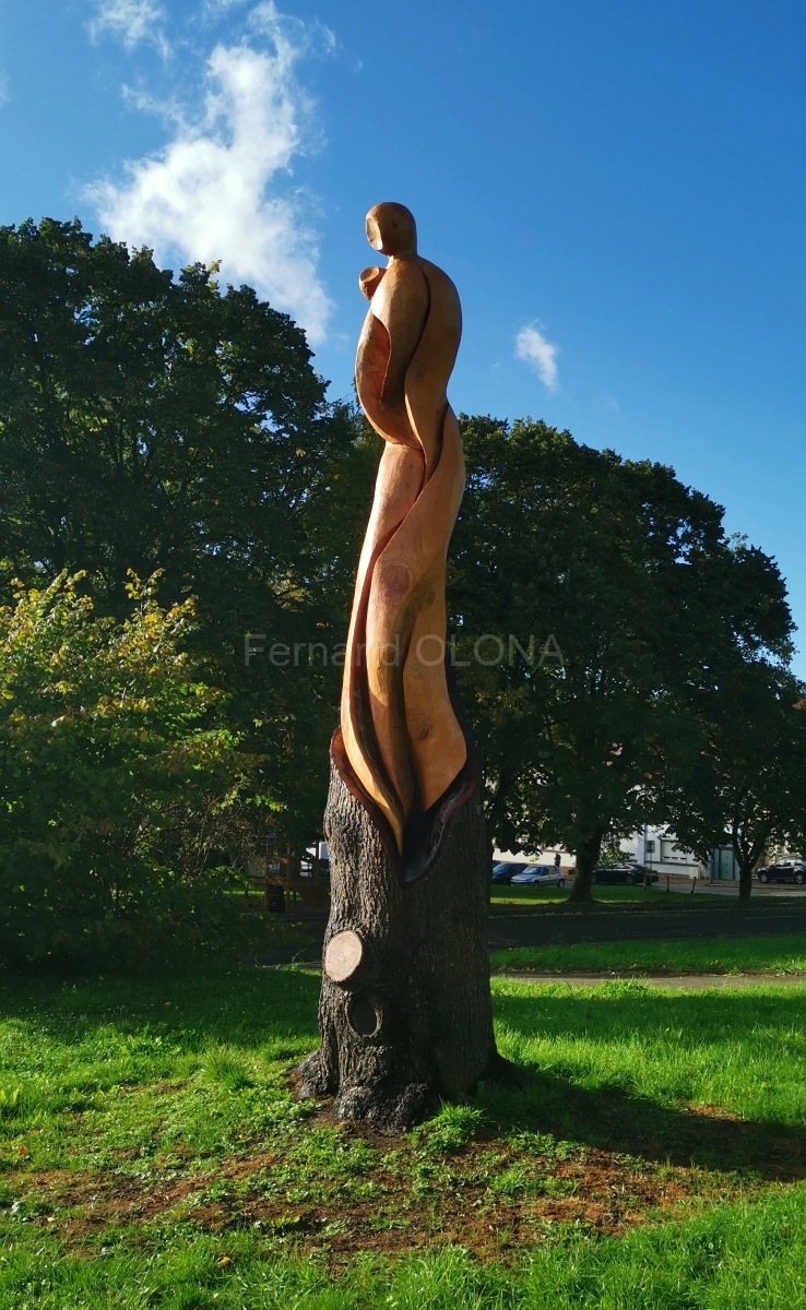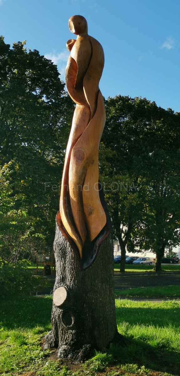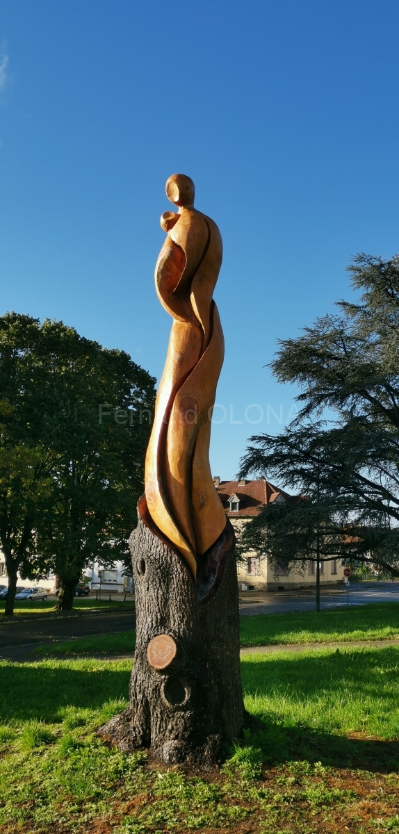 La Vierge à l’Enfant érigée devant l’église du Sacré-Cœur de Sarreguemines est née de l’ambition de Fernand OLONA d’offrir à sa ville une œuvre unique, sculptée dans le tronc d’un cèdre du Liban centenaire. Ayant demandé plus d’un mois de travail et 200 heures à tronçonner et à sculpter, l’œuvre aux lignes contemporaines se dresse fièrement devant son église et fait le bonheur des paroissiens.